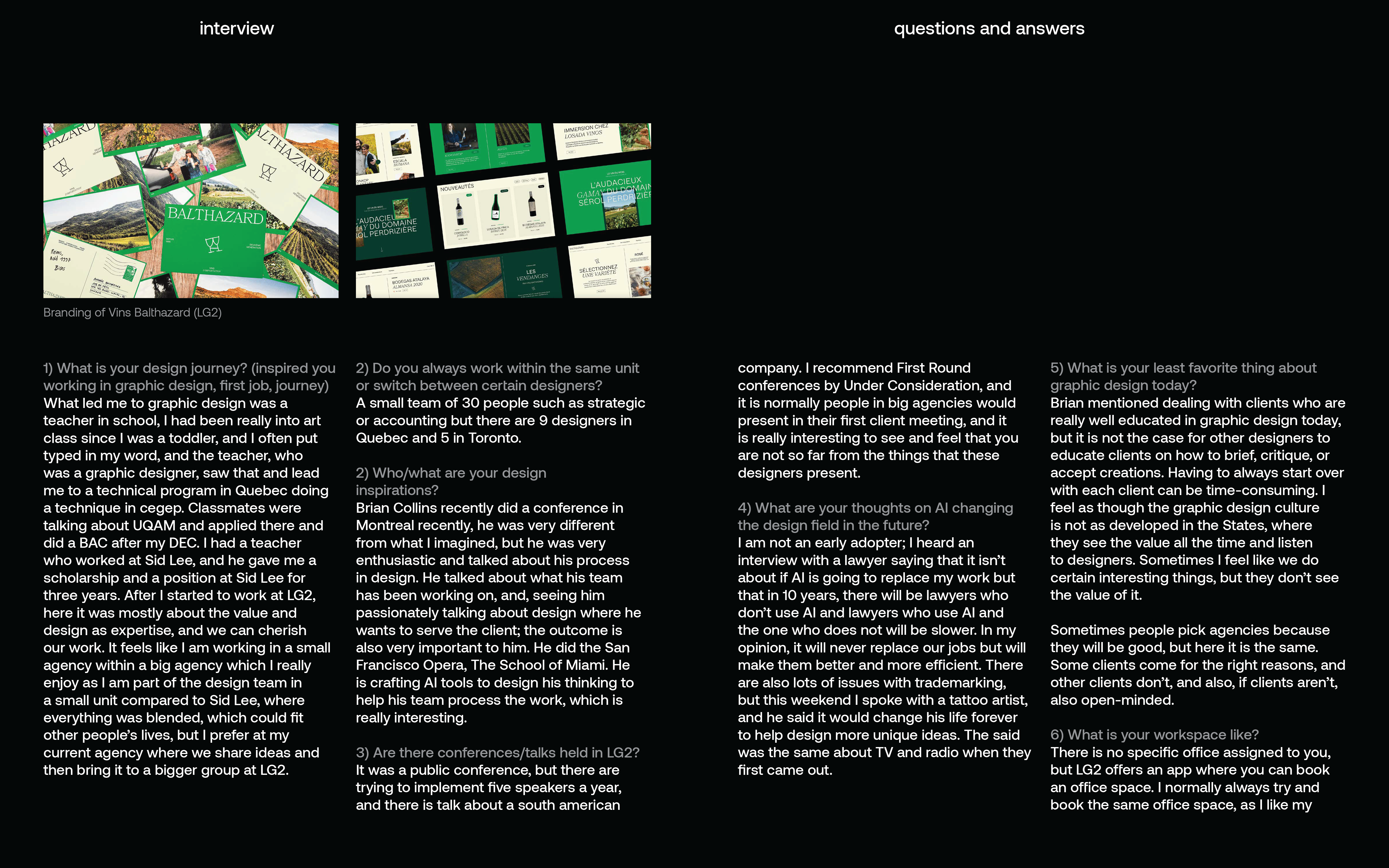 We had to write and ask our own 20 questions, which was a challenge for me, being a rather reserved person. It pushed me out of my comfort zone, but it also allowed me to ask questions that intrigued me and that I wanted to ask someone who works professionally, to get their perspective. I also took the opportunity to show him a project I had completed and ask his opinion.The experience was a learning experience as it allowed me to gain direct professional insight and advice from someone established in the design field. Visiting LG2’s office provided significant inspiration for the layout design, incorporating elements that reflect the grandeur and aesthetic of the building.