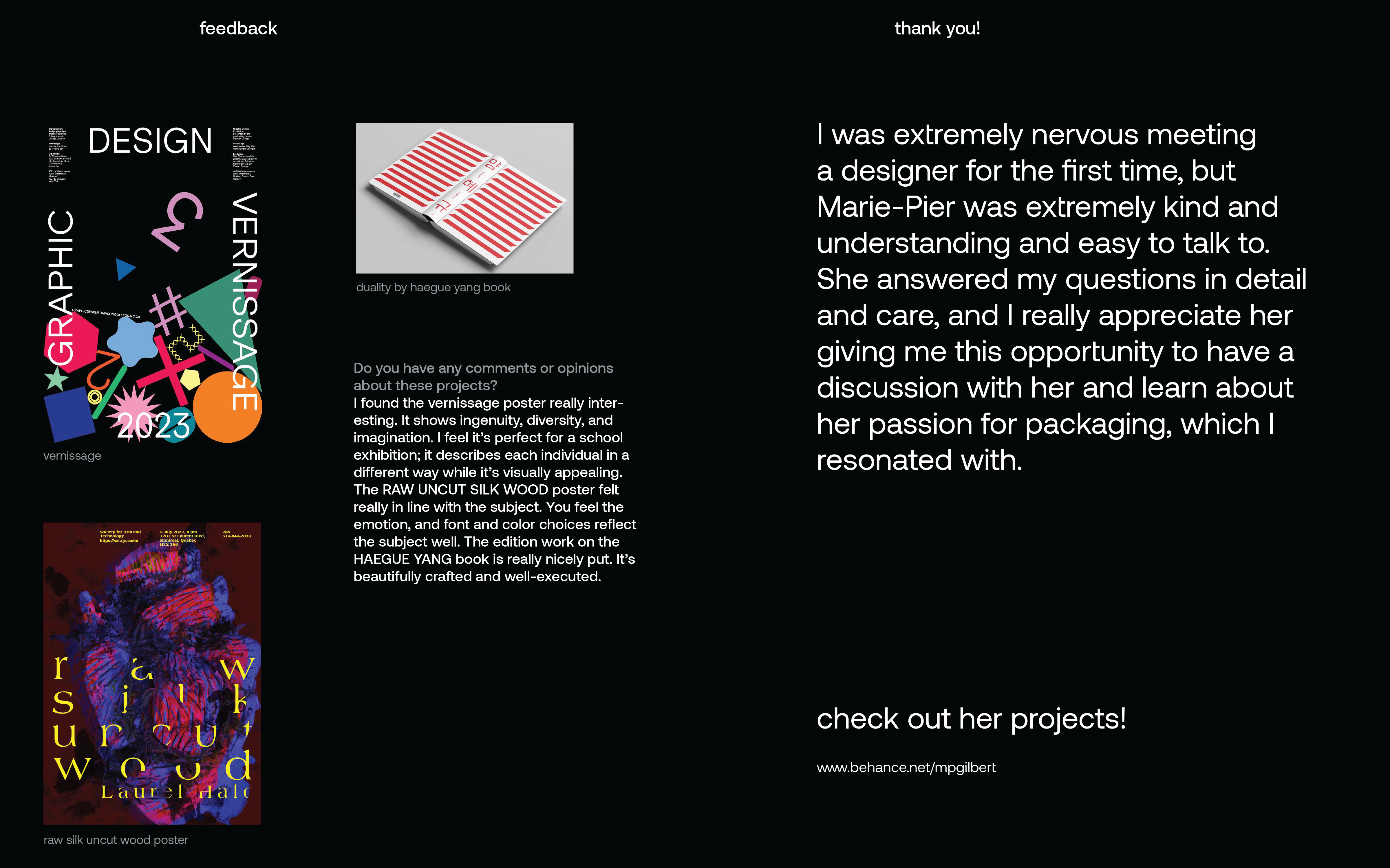 As part of my professional studies course, we were asked to interview a designer who inspires us, and I chose Marie-Pier Gilbert from LG2. She was kind enough to show me around the beautiful office and answer all my questions.