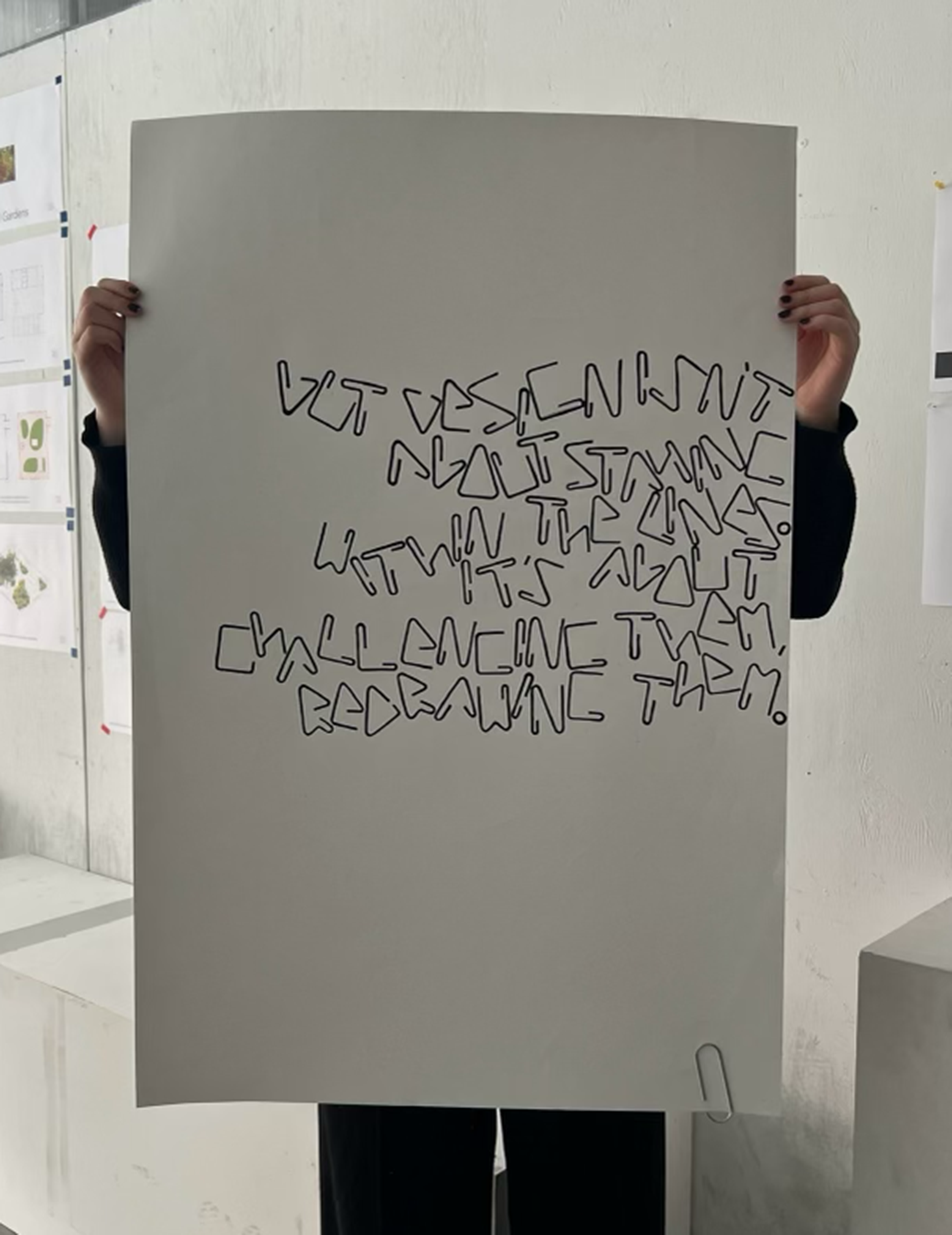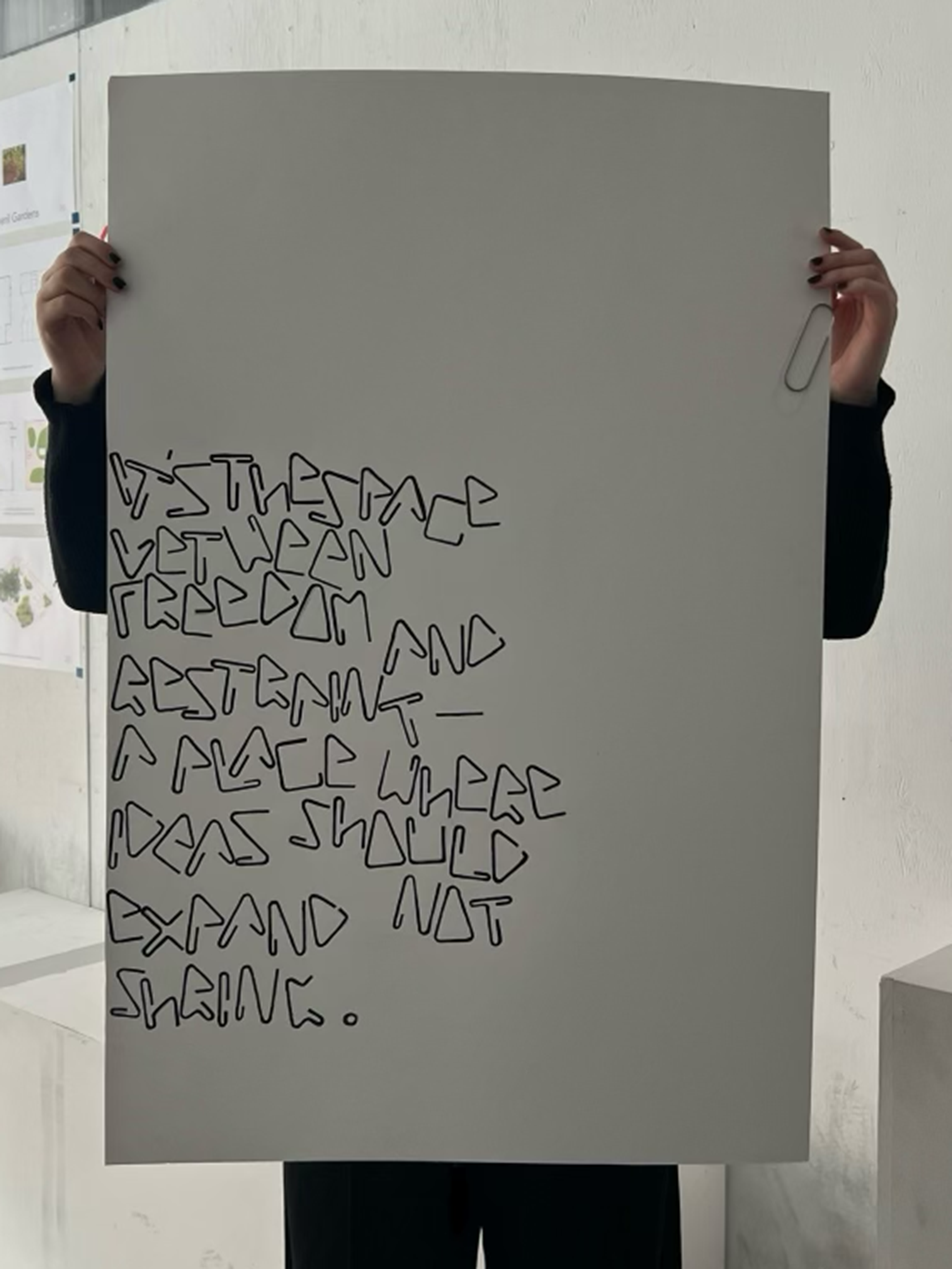 The final result is a typeface constructed entirely from the forms and curves of a paper clip, digitally refined and laser-cut into a reusable plastic stencil. Using this tool, we meticulously hand-drew our full design brief onto a series of five posters. The posters serve both as a display of our typeface and as a manifesto of our creative values.